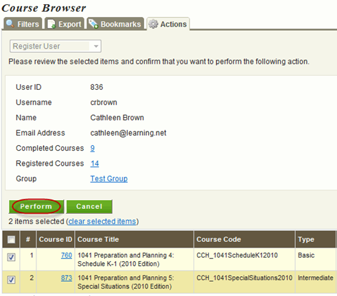 - On the screen that appears make sure that you have selected the appropriate courses and select Perform to complete the registration. If you would like to cancel this registration, select Cancel.